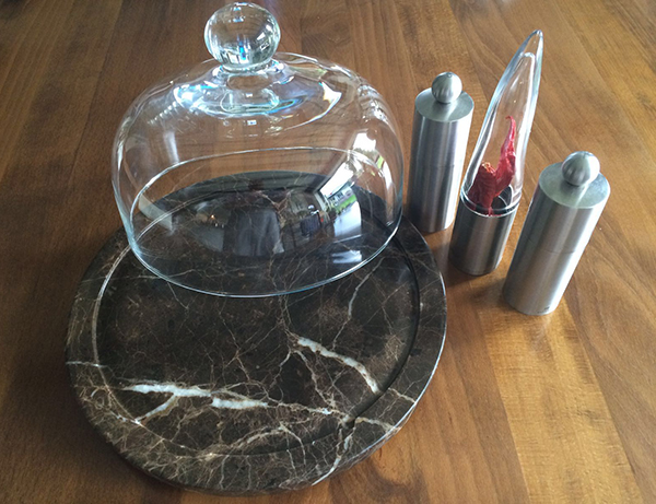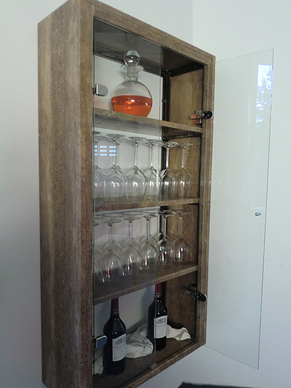 Naturstein-Accessoires sowie Schrank aus Travertin Noce |